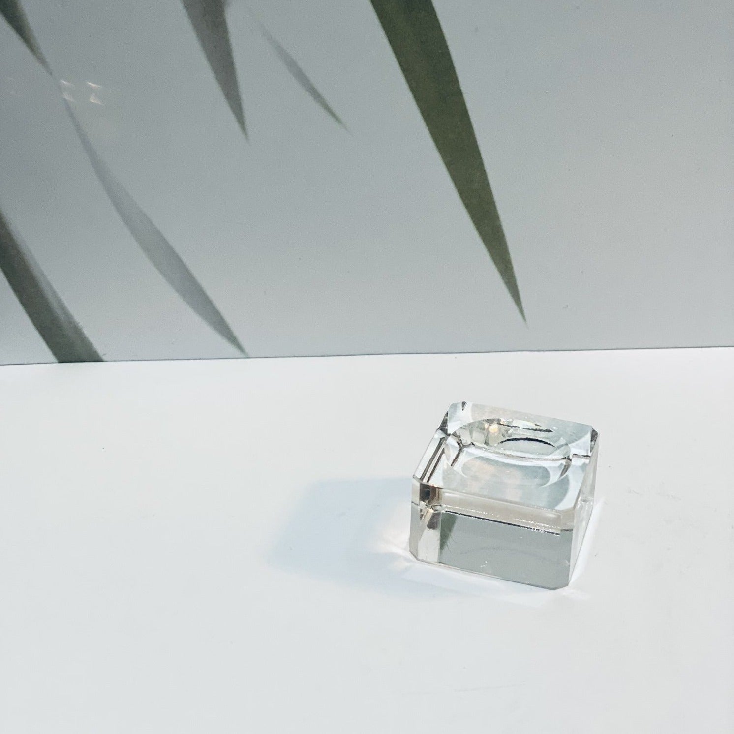 Clear glass cube-shaped holders for spheres.